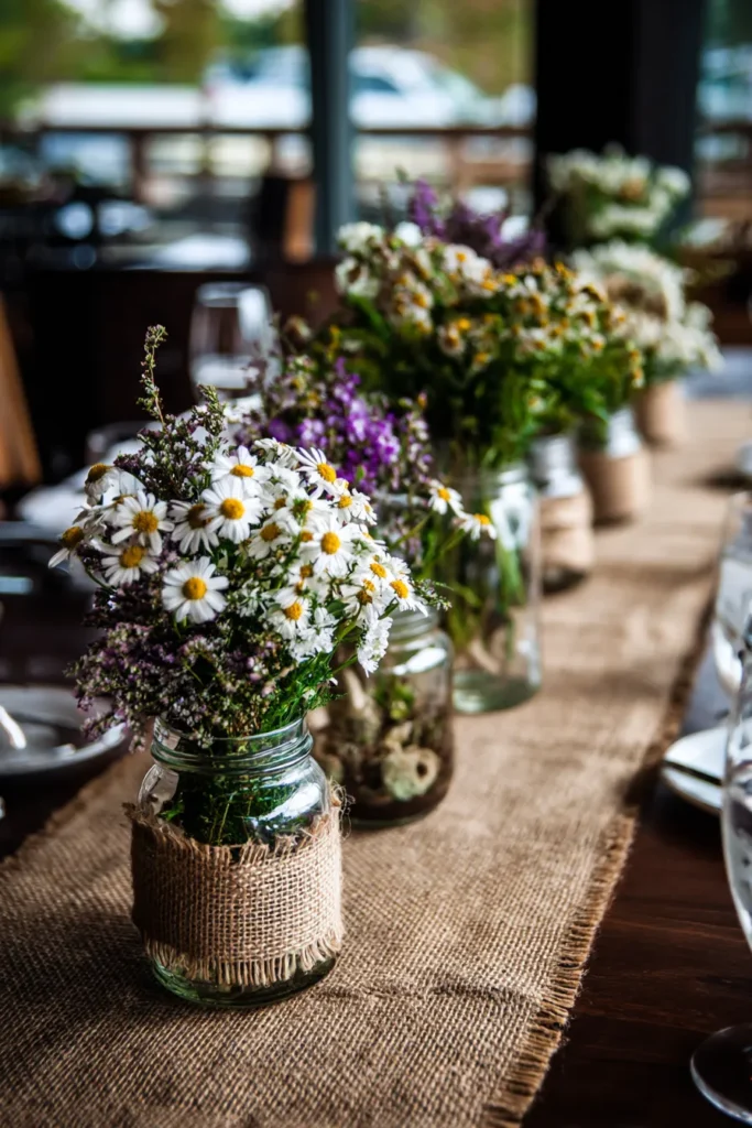 This tablescape features a row of mason jars wrapped in burlap and twine, each filled with cheerful spring wildflowers like daisies, lavender, and soft greenery. The jars sit neatly along a rustic fabric runner, creating a relaxed and charming flow down the table. The mix of white, yellow, and purple blooms adds color without feeling overwhelming, and the natural textures keep everything grounded and inviting.