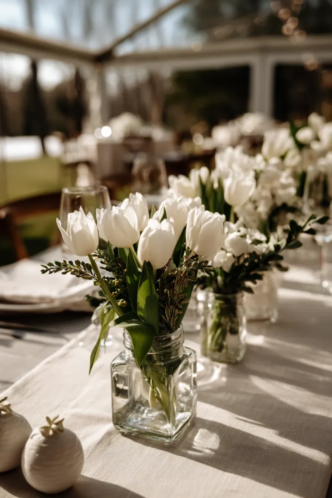 This tablescape features rows of white tulips arranged in simple square glass jars filled with clear water. The tulips stand tall and fresh, paired with soft greenery that adds a natural spring touch. Set on light linen tablecloths with neutral place settings, the look feels airy, bright, and beautifully understated under the soft glow of a tented outdoor setting.