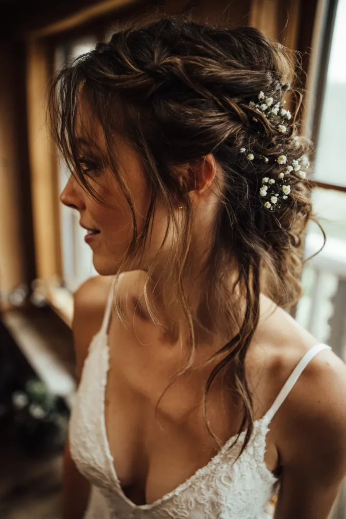 This bridal hairstyle features a loose braided updo with soft texture and gentle volume, styled to look effortless and romantic. Wispy face framing strands fall naturally around the cheeks and neck, giving the look a relaxed feel. Tiny sprigs of baby’s breath are tucked throughout the braid, adding a delicate floral touch that feels light and spring ready. The overall finish looks airy rather than structured, which works beautifully with the breezy vibe of an outdoor or countryside wedding.
