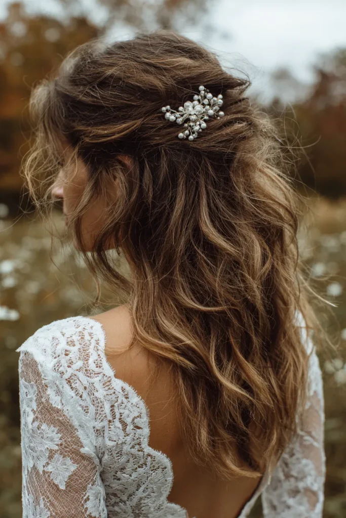 This bridal hairstyle features soft loose waves styled half up, with the top section gently pulled back and secured using a delicate pearl hair clip. The waves fall naturally down the back with plenty of movement, creating a relaxed and romantic finish. The look pairs beautifully with a lace wedding dress that has sheer sleeves and an open back, making it perfect for an outdoor spring celebration.