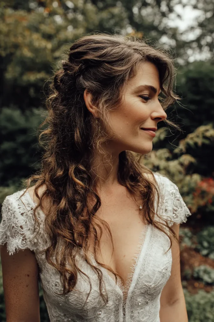 This bridal hairstyle features natural curls worn half up with gentle volume through the crown and soft texture throughout. The top sections are loosely pulled back while the rest of the curls fall freely over the shoulders, creating a relaxed and romantic shape. The look pairs beautifully with a lace wedding dress that has delicate sleeves and a deep neckline, keeping everything light and effortless for an outdoor spring setting.