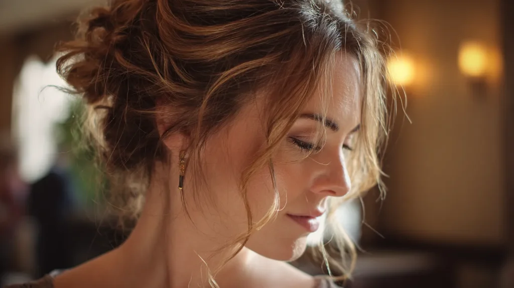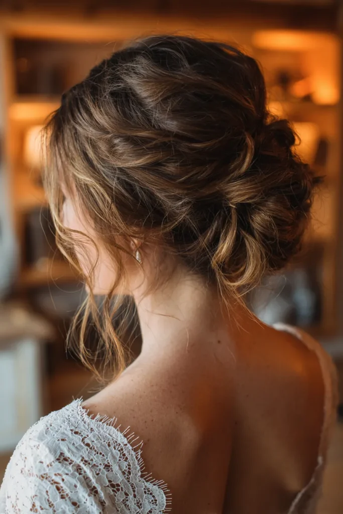 I am completely obsessed with how effortlessly chic this updo looks—it has all the elegance of a formal style but none of the stiffness. The way the light catches those highlights woven through the messy curls is simply breathtaking, making the whole look feel so rich and dimensional. Keeping the hair fully up is a fabulous choice because it completely shows off the beautiful back and shoulder detail of that lace gown. It’s the perfect hairstyle to feel fancy and romantic without feeling overly done.