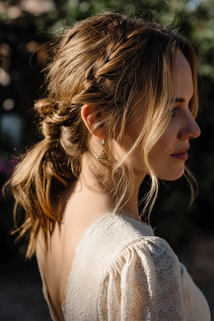 This bridal hairstyle features a loose low ponytail with a subtle braid woven along the side, adding gentle detail without feeling structured. Soft face framing strands fall naturally around the cheeks, and the ponytail itself has light waves and movement that catch the sunlight. Paired with a lace wedding dress and delicate earrings, the overall look feels airy, romantic, and perfectly suited for a spring ceremony outdoors.
