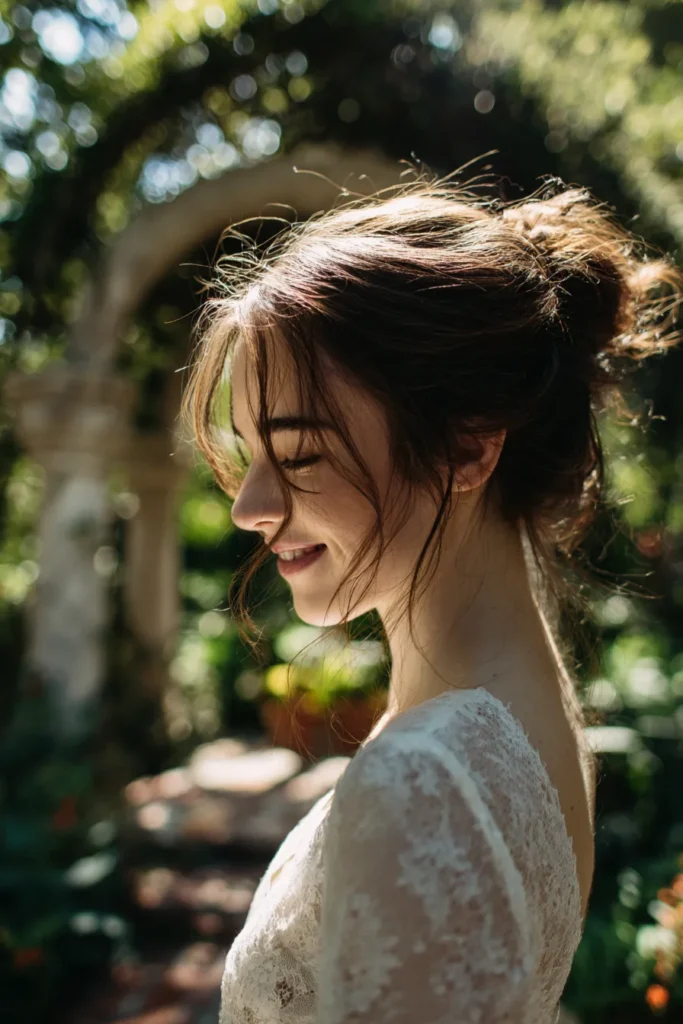 This bridal hairstyle features a softly textured bun gathered high with loose strands and wispy bangs framing the face. The hair is intentionally undone, with gentle flyaways catching the light and adding movement. Paired with a lace wedding dress and natural makeup, the look feels airy and romantic, especially against a garden backdrop filled with greenery and filtered sunlight.