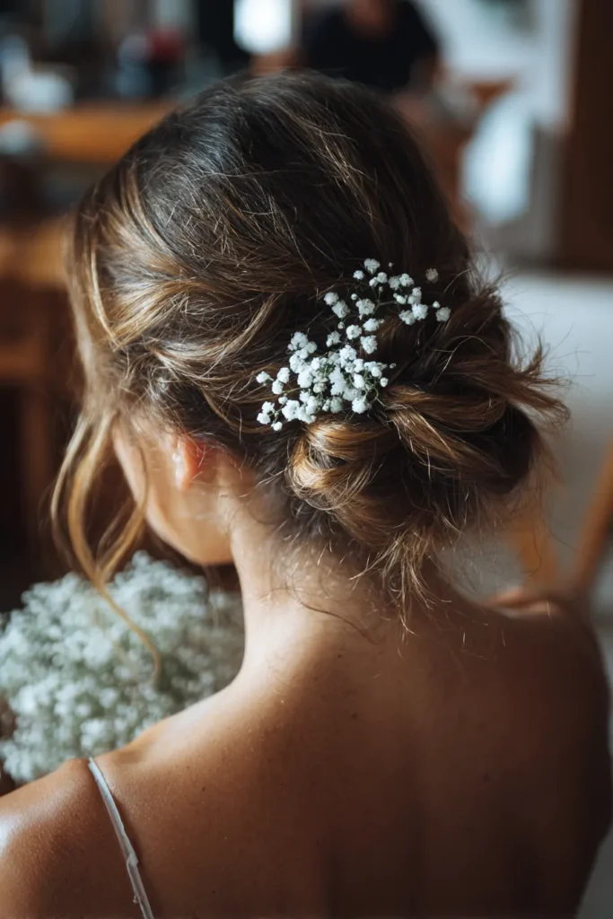 This bridal hairstyle features a soft low chignon styled at the nape with gentle twists and natural texture. Tiny sprigs of baby’s breath are tucked into the bun, adding a delicate floral accent that feels light and romantic. Loose strands frame the neck and sides, and the overall look pairs beautifully with a simple strap dress and a fresh spring bouquet.