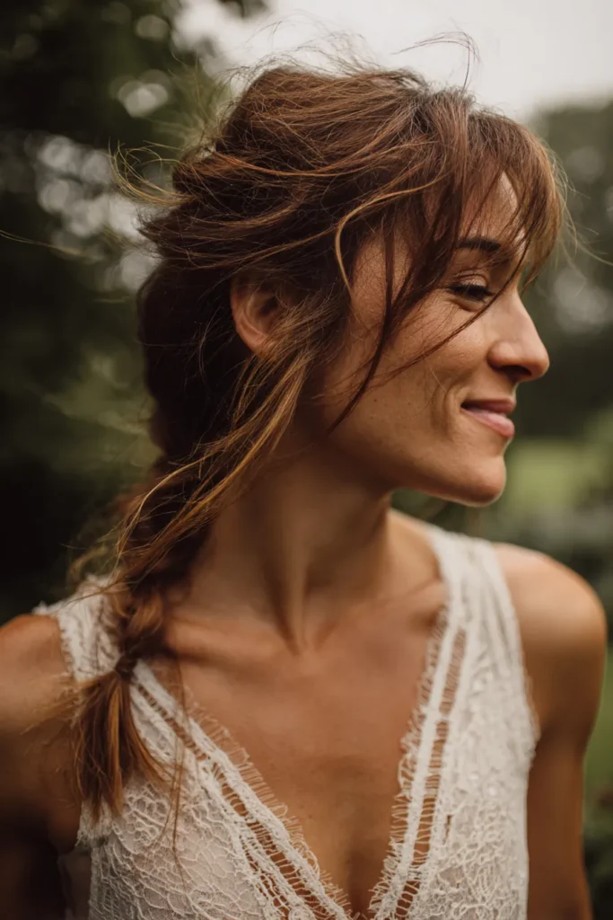 This bridal hairstyle features a relaxed side braid with soft layers and wispy pieces falling freely around the face. The braid is gently textured rather than tight, allowing strands to lift and move naturally in the breeze. Paired with a lace wedding dress that has a deep neckline and delicate detailing, the overall look feels light, romantic, and perfectly suited for an outdoor spring setting.