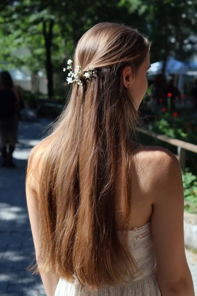 This gorgeous spring bridal look showcases super long, sun-kissed hair styled in a simple, half-up and half-down way. The hair flows straight down the back, catching the light beautifully and highlighting its rich, warm color and natural texture. A delicate hairpiece made of small white blossoms and tiny green stems is tucked neatly into the secured half-up section, adding an organic, freshly picked touch. The bride is wearing a stunning white strapless or lace-trimmed gown, keeping the overall ensemble light and airy for an outdoor celebration.