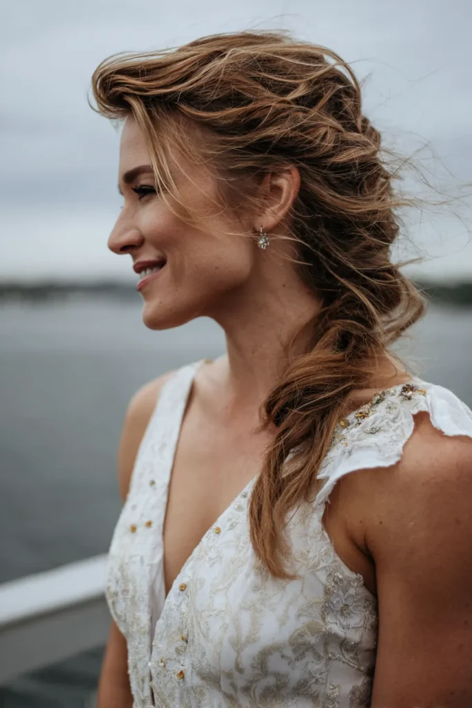 This style is seriously genius for any breezy, outdoor wedding, especially near the water like this. The way the wind is playing with those pieces around her face and the volume at the crown just makes the whole look so dynamic and alive, which is perfect for capturing natural, emotional photos. A chunky, intentionally messy side braid is such a practical yet stylish choice because it keeps the hair contained while still looking completely romantic and boho chic. Plus, the airy hairstyle perfectly complements that gorgeous, heavily detailed gown.