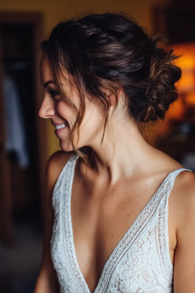 I completely adore this hairstyle because it manages to be incredibly detailed and secure while still looking totally soft and airy. Incorporating a loose braid into the texture of the low bun is such a beautiful way to add interest and keep it from looking too plain. The messy, face-framing tendrils are the ultimate detail because they make the whole style feel casual and flattering, perfect for a happy, relaxed bride enjoying her special day. This is proof that a bun doesn’t have to feel formal to be stunning.