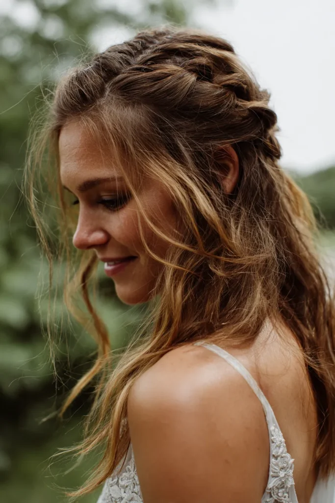 I love how romantic and effortless this style feels, especially for an outdoor spring wedding. The braid adds structure while the loose strands keep everything relaxed and natural. It feels secure without looking tight, which is such a win on a windy day. If you want something that feels timeless but still fresh and free spirited, this braided crown look is absolutely stunning.