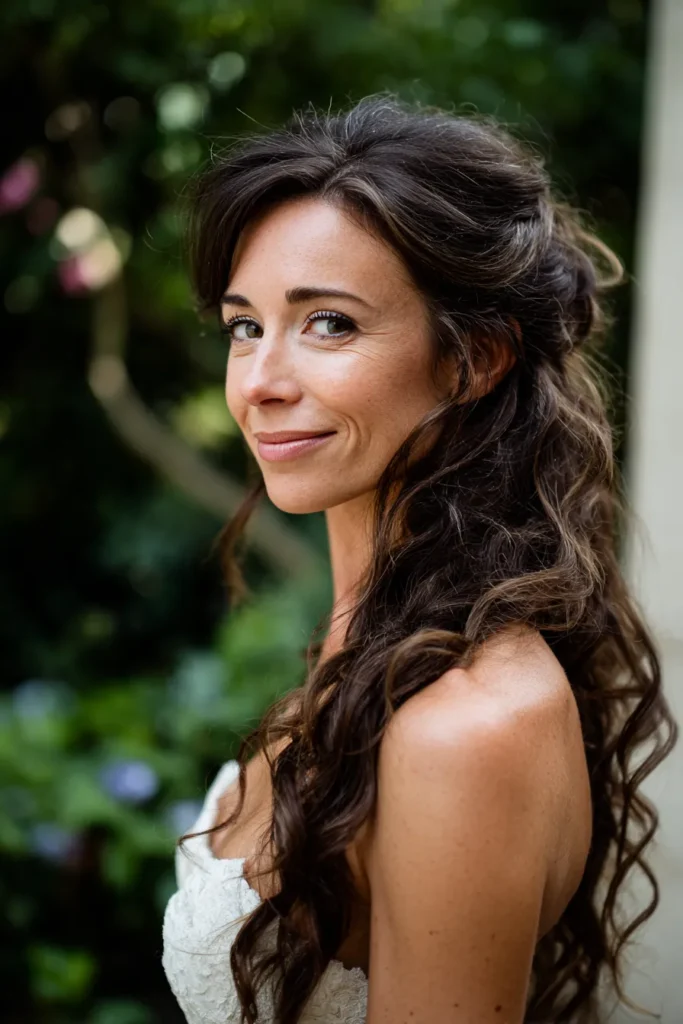 I love how this style feels elegant without looking overdone. The half up shape keeps curls out of the face while still letting them move naturally in the breeze. It feels flattering, comfortable, and full of personality, which is perfect for brides who want to look polished but still like themselves. If you are into soft curls that feel timeless and easygoing, this hairstyle is such a beautiful choice.