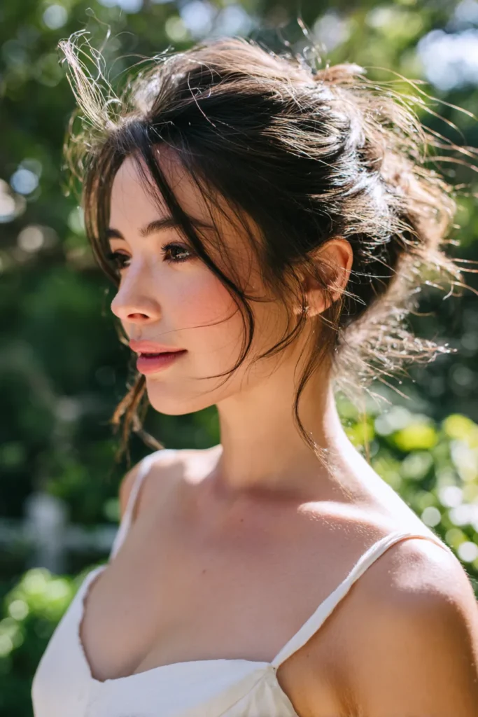 This beautiful, sun-drenched close-up features an incredibly chic and relaxed updo with a focus on texture and a natural glow. Her dark brown hair is gathered high and loosely pinned in a messy bun, allowing tons of flyaways around the crown to catch the light and create a soft, airy halo effect. Loose, wavy pieces frame her face, perfectly complementing her fresh makeup with a rosy blush and soft pink lip. She is wearing a simple, elegant white gown with thin spaghetti straps and a gentle scoop neckline, ideal for a warm spring day.