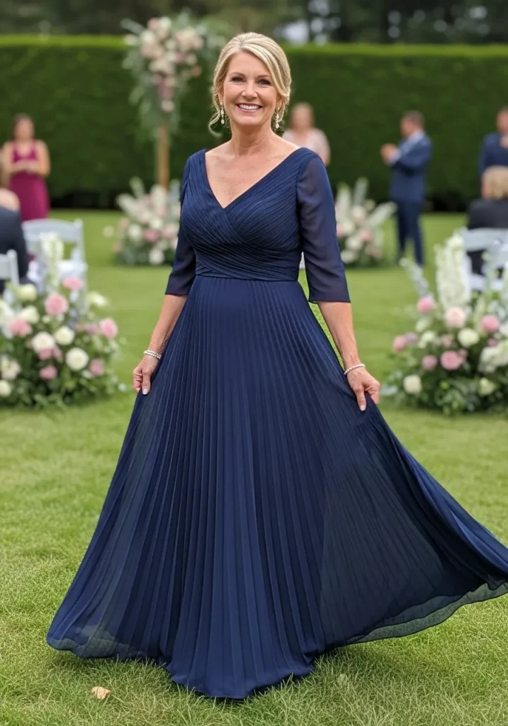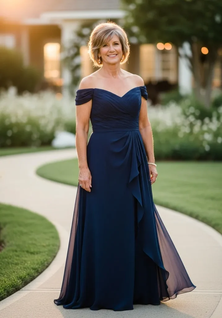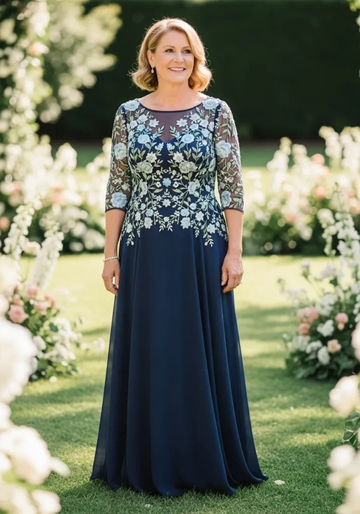 This look features a mature woman wearing a navy blue mother of the bride gown with a flattering V neckline, soft chiffon fabric, and a gently flowing skirt that moves beautifully in natural light. The fitted bodice creates a polished shape while the airy skirt adds lightness, making the overall silhouette feel effortless and romantic in a garden setting.