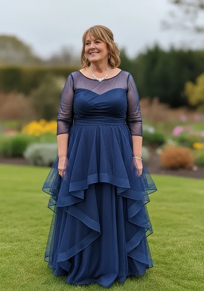 This look features a mature woman wearing a navy blue chiffon mother of the bride gown with soft layered ruffles and a gently draped bodice that moves beautifully with every step. The airy skirt creates graceful volume while the lightweight fabric catches the light, making the entire silhouette feel romantic and effortless against the natural garden backdrop.