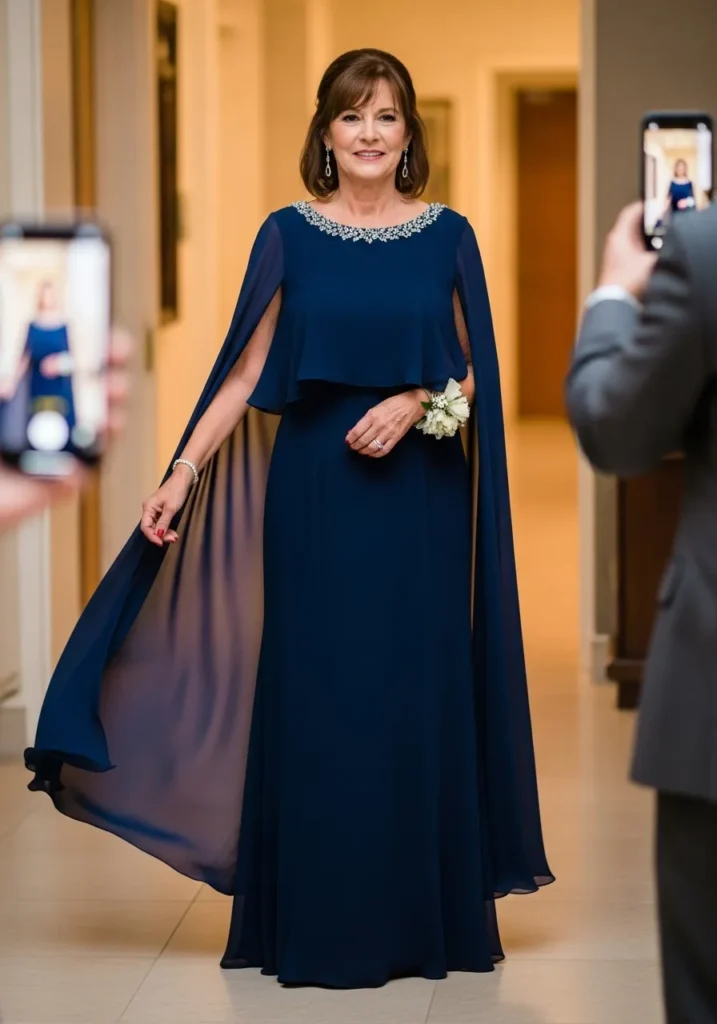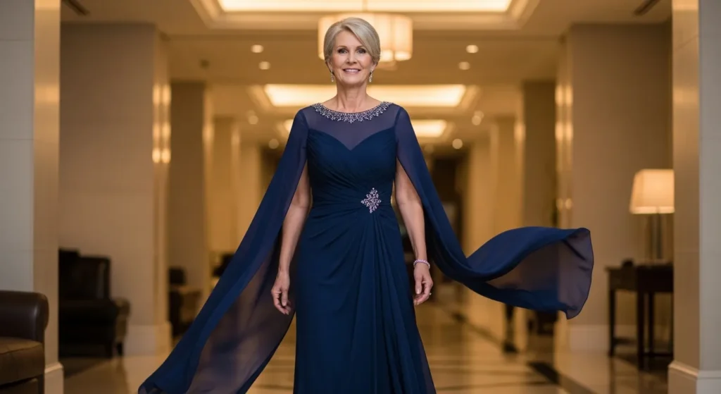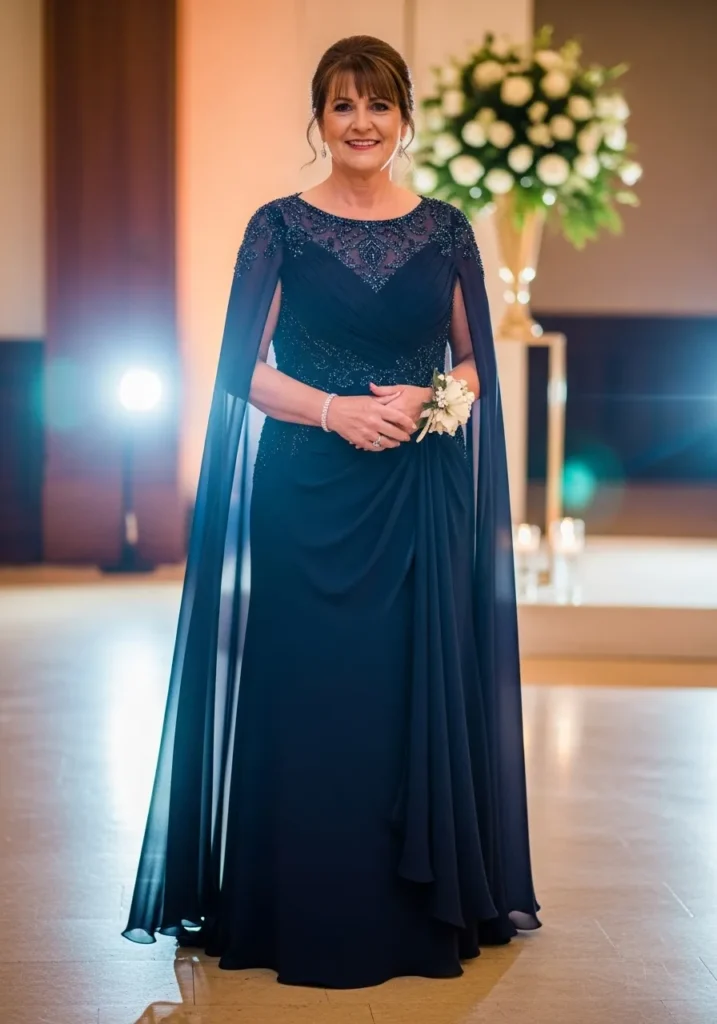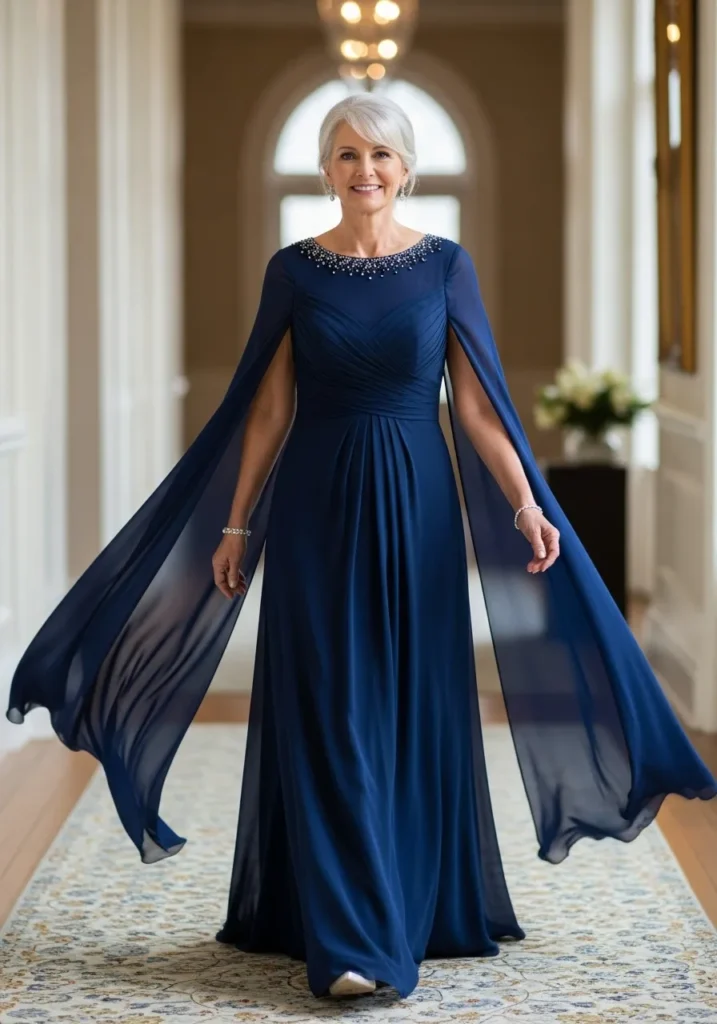This look highlights a mature woman wearing a navy blue chiffon cape gown with gentle draping and a smooth flowing skirt. The airy overlay creates beautiful motion while the simple silhouette keeps everything timeless and flattering.