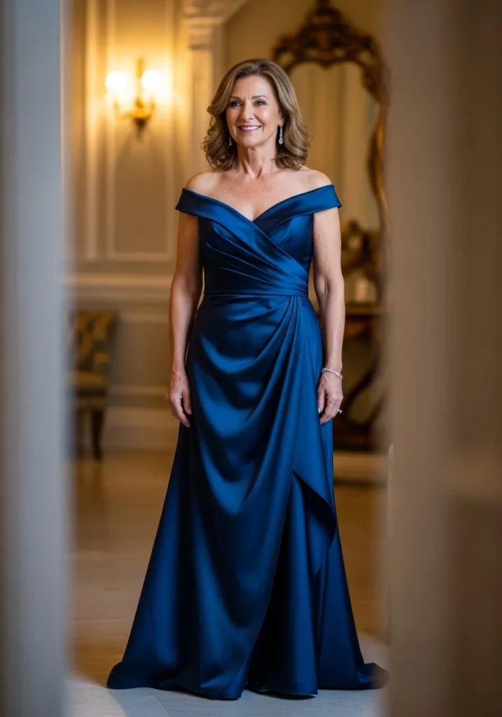 This navy blue satin mother of the bride gown features an off shoulder neckline and soft draping across the bodice, creating a sleek and glamorous silhouette. The rich fabric catches the light beautifully, giving the gown depth and luxurious shine.
