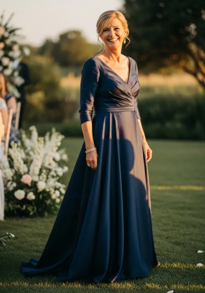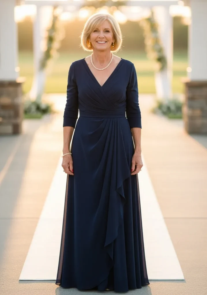 This look features a mature woman in a navy blue mother of the bride gown with a flattering V neckline and a softly draped skirt that flows naturally with every step. The lightweight fabric creates gentle movement, while the clean silhouette keeps the look timeless and refined for a formal wedding setting.