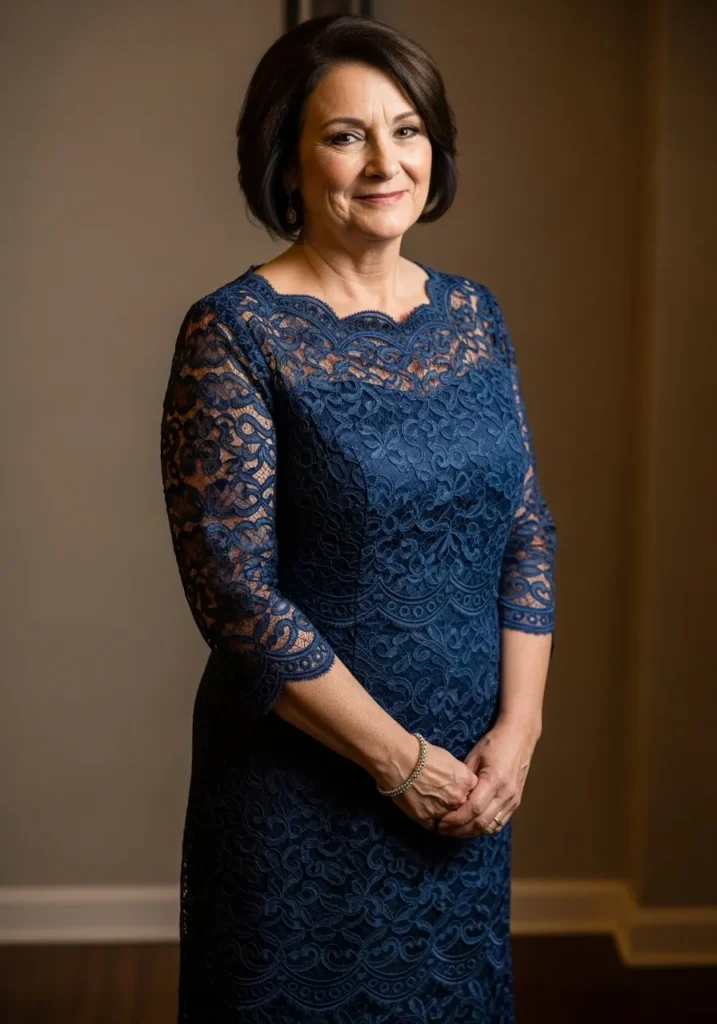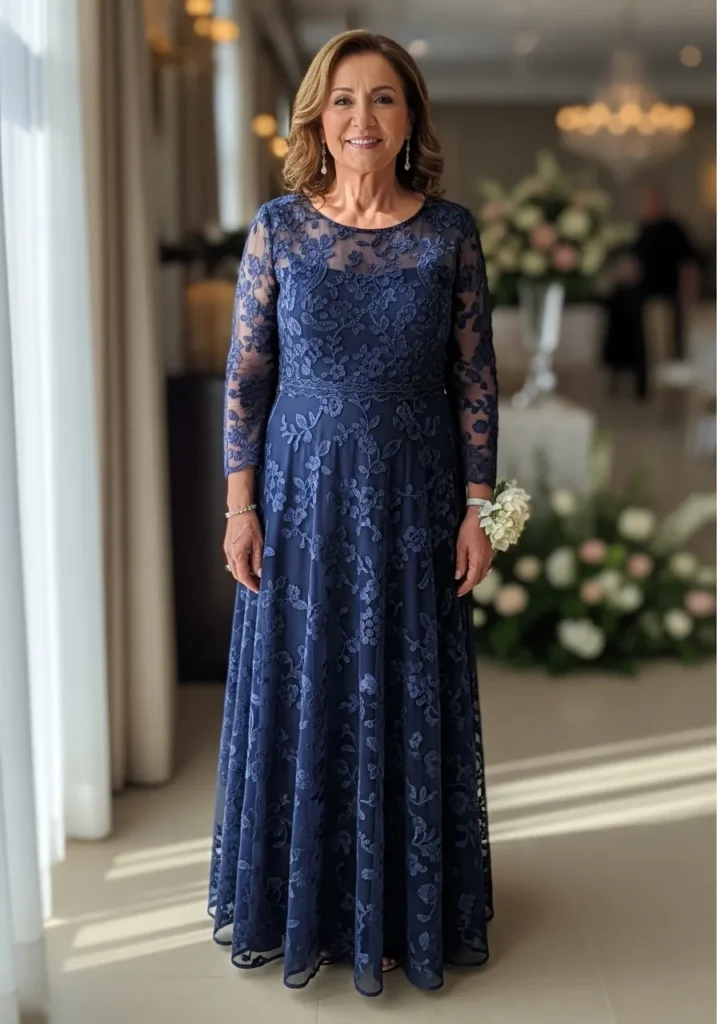 This navy blue lace mother of the bride dress features intricate floral patterns, sheer sleeves, and a softly fitted shape that highlights the waist while keeping the overall look graceful. The detailed lace texture adds depth and softness, creating a beautifully romantic feel.