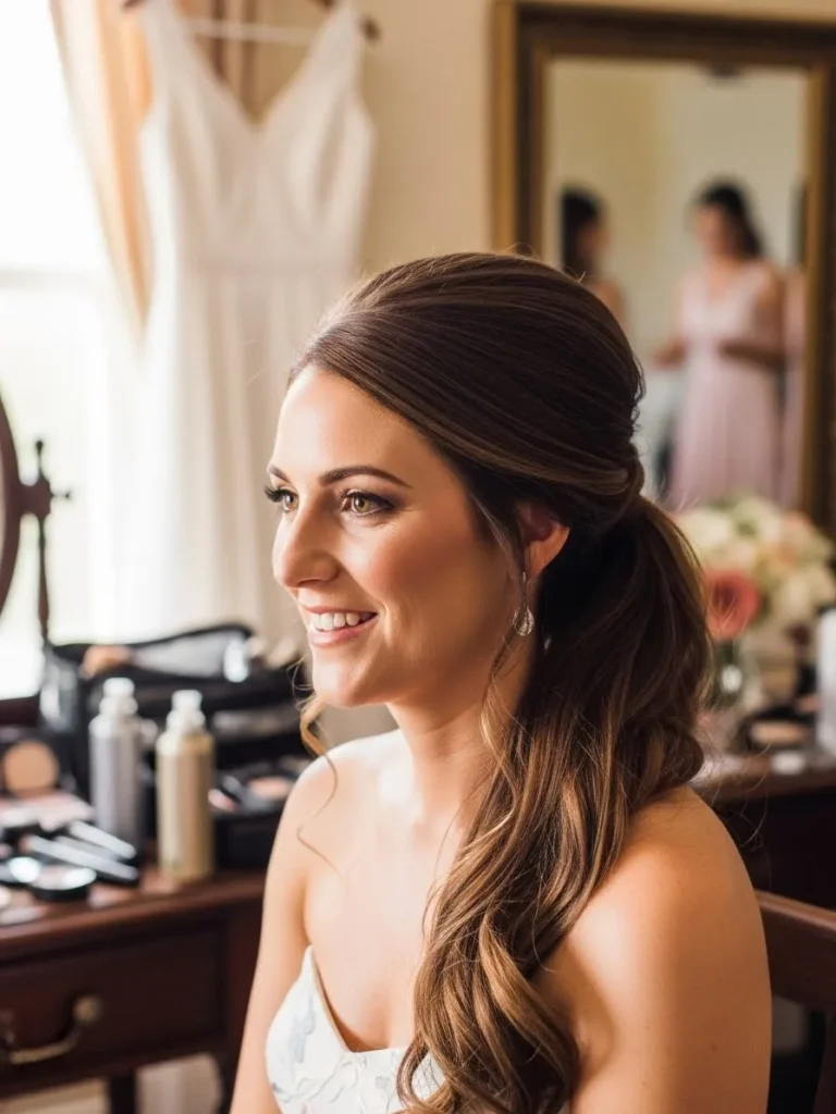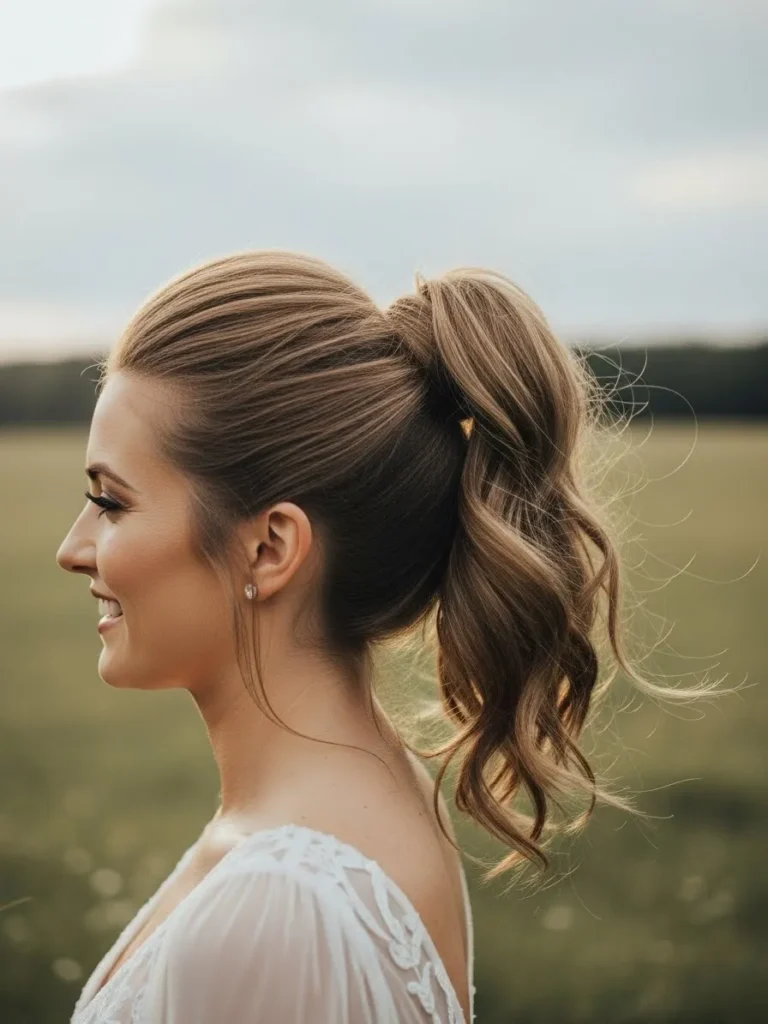 This hairstyle features a lifted ponytail with plenty of volume at the crown and loose waves flowing through the length. The hair is softly smoothed around the face, while the ponytail sits high enough to feel youthful but still polished. The overall look feels airy and natural, perfect for an outdoor summer wedding.