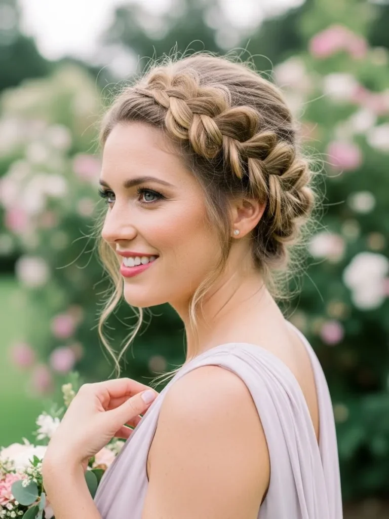 This style features a braid that wraps around the head like a crown, paired with gentle volume throughout. The braid is slightly loose, giving it a soft and romantic finish. Everything feels airy and balanced.