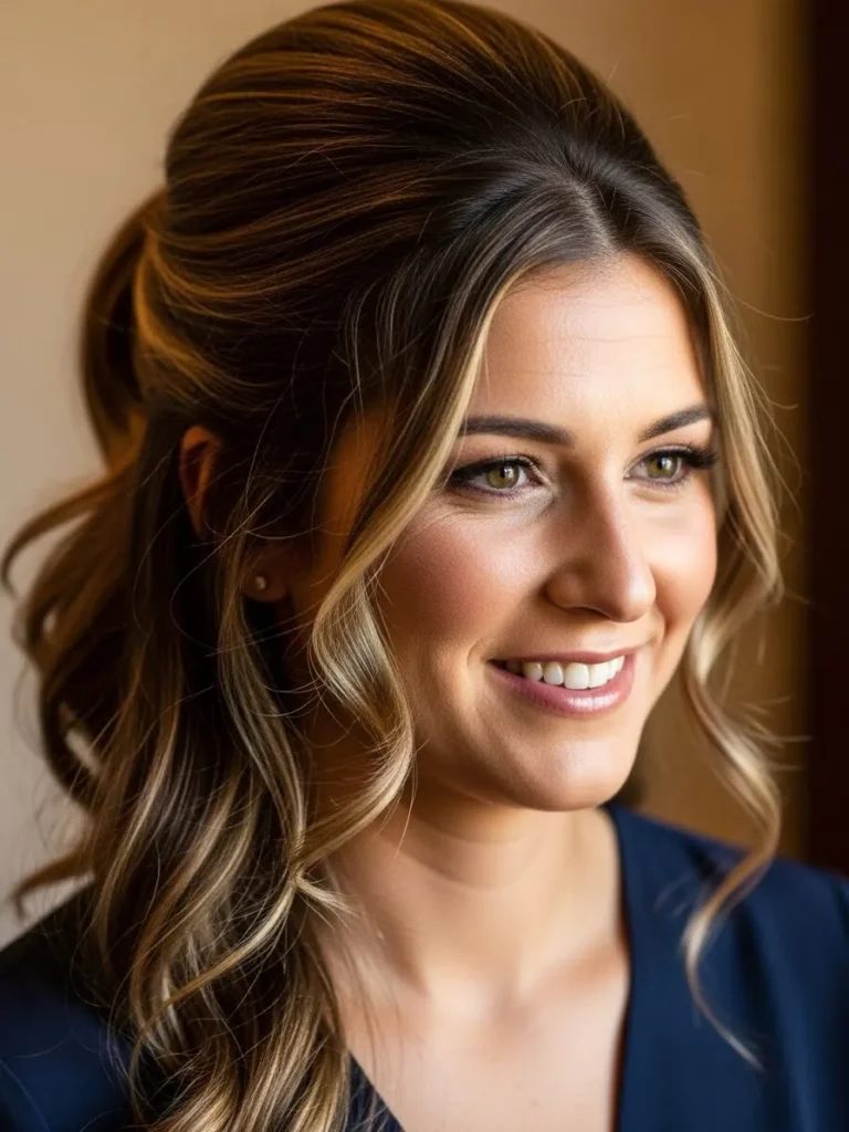 This hairstyle shows a half up look with soft waves and gentle volume throughout. The hair is loosely pulled back, allowing movement and texture to shine. The waves frame the face beautifully.