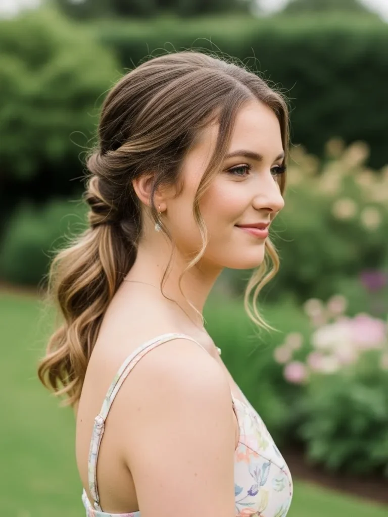 This look shows a ponytail styled to one side with soft waves running through the length. The crown has gentle lift, while the ponytail itself feels full and bouncy. Everything looks smooth but never tight.
