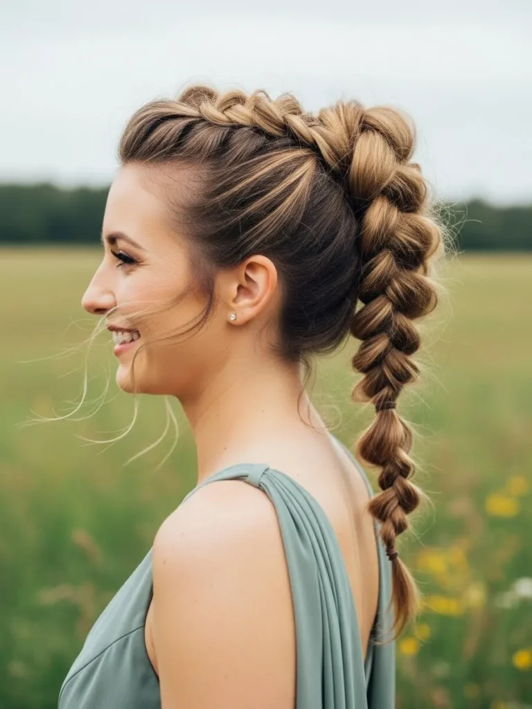 This hairstyle features a thick braided ponytail with noticeable lift at the crown. The braid is bold and textured, creating a strong visual impact while still feeling soft. The ponytail length adds movement and interest.