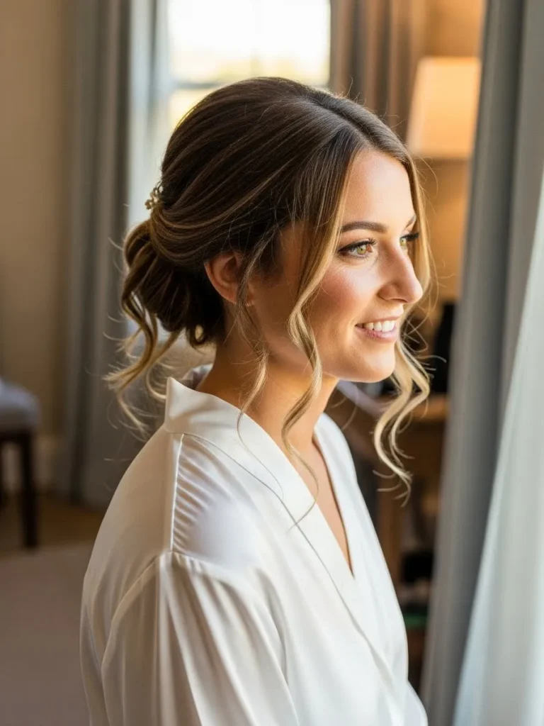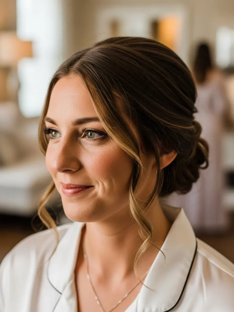 This style feels so flattering and easygoing to me. I love how it highlights the face while still giving that lifted look on top. It works beautifully for both indoor and outdoor weddings.