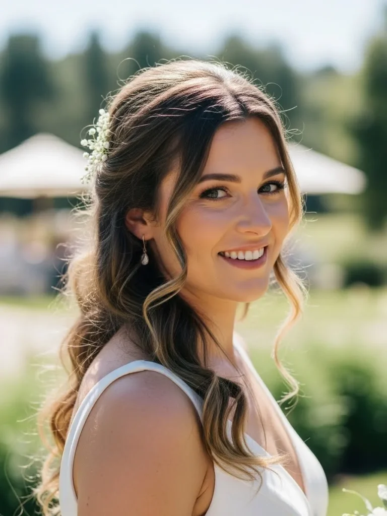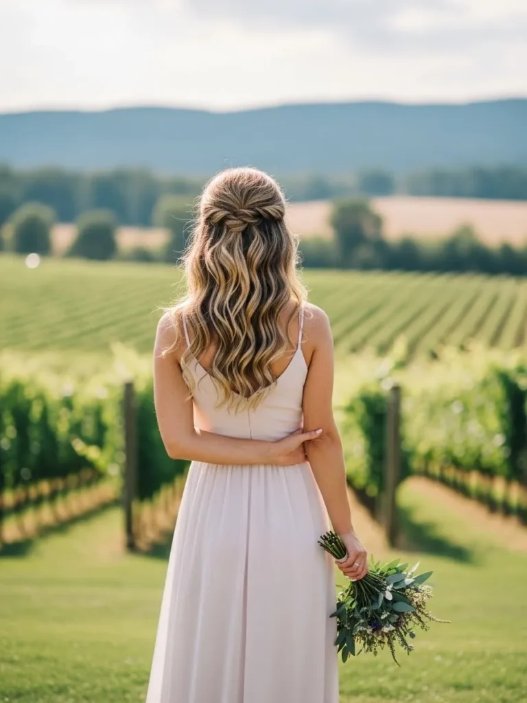 I find this look incredibly charming and feminine. The braid adds interest without feeling heavy, and the volume keeps it from looking flat. It feels especially lovely for garden or outdoor summer weddings.