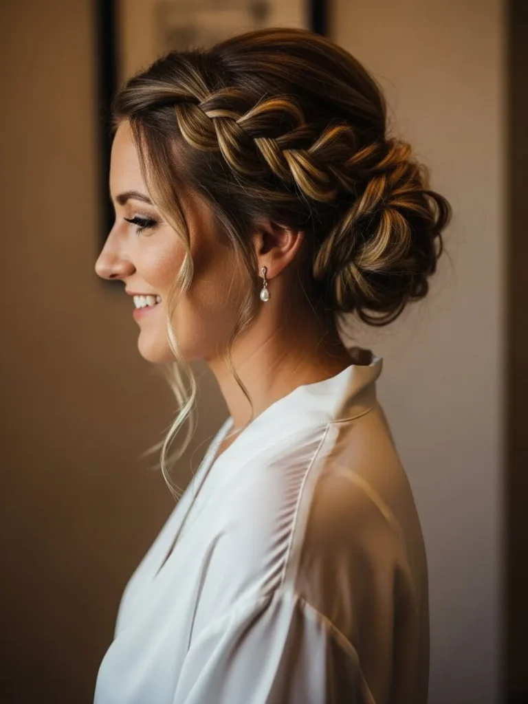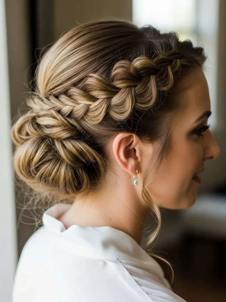 This look features a braided section woven into a low bun, with volume at the crown for added dimension. The braid adds texture, while the bun keeps the style neat and secure. Everything feels balanced and thoughtful.