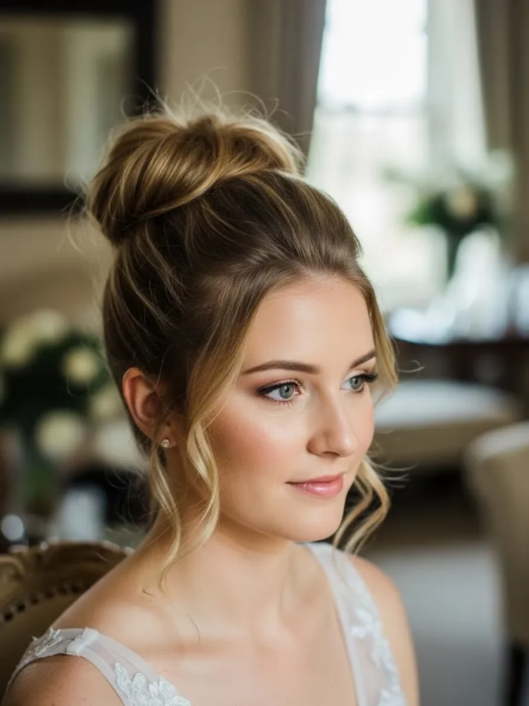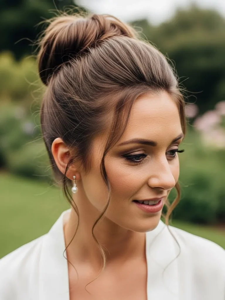 This hairstyle features a high bun with visible volume at the crown and soft strands left loose around the face. The bun is full and slightly textured rather than sleek, giving it a relaxed and romantic feel. The face framing pieces add softness and keep the look from feeling too structured.