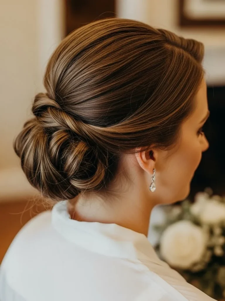 This look features a low bun with a smooth finish and a softly twisted section adding interest at the back. The crown has just enough volume to keep the style from feeling flat. The bun sits neatly at the nape for a clean silhouette.