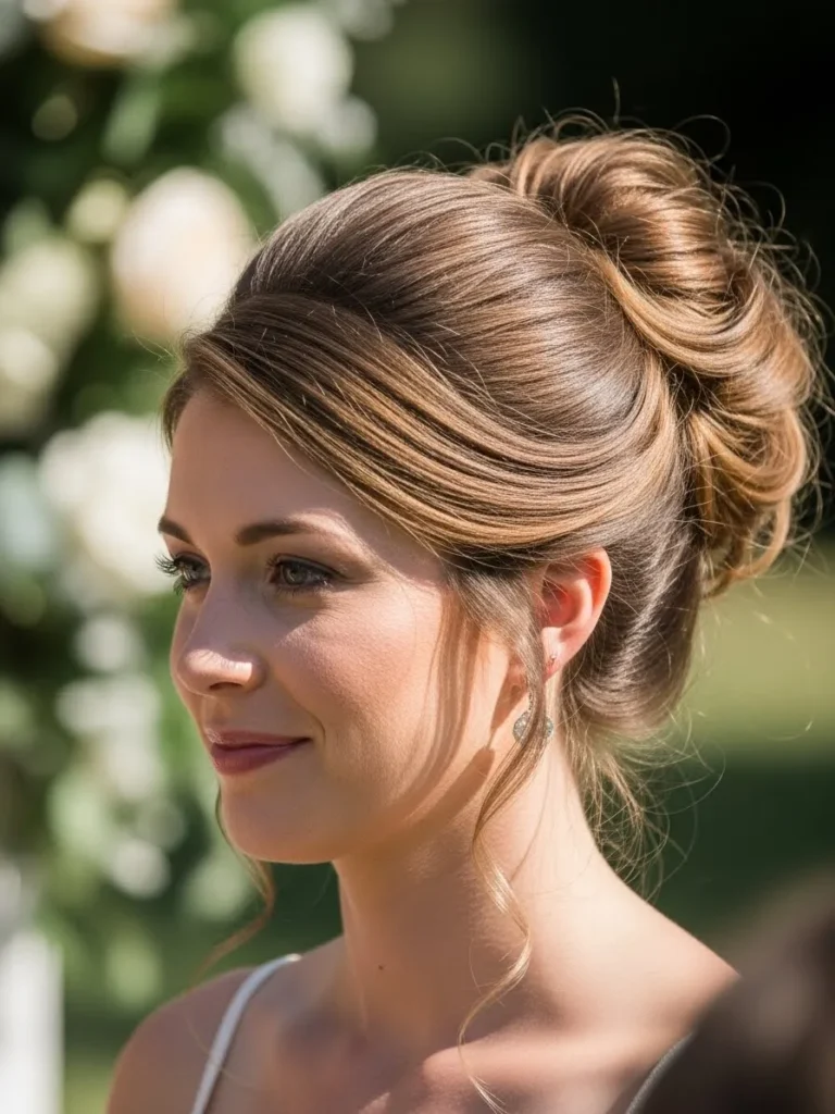 This look features a high bun with visible texture and fullness at the top. The hair is swept back softly, with subtle volume creating a lifted shape. A few loose strands around the face add balance and softness.