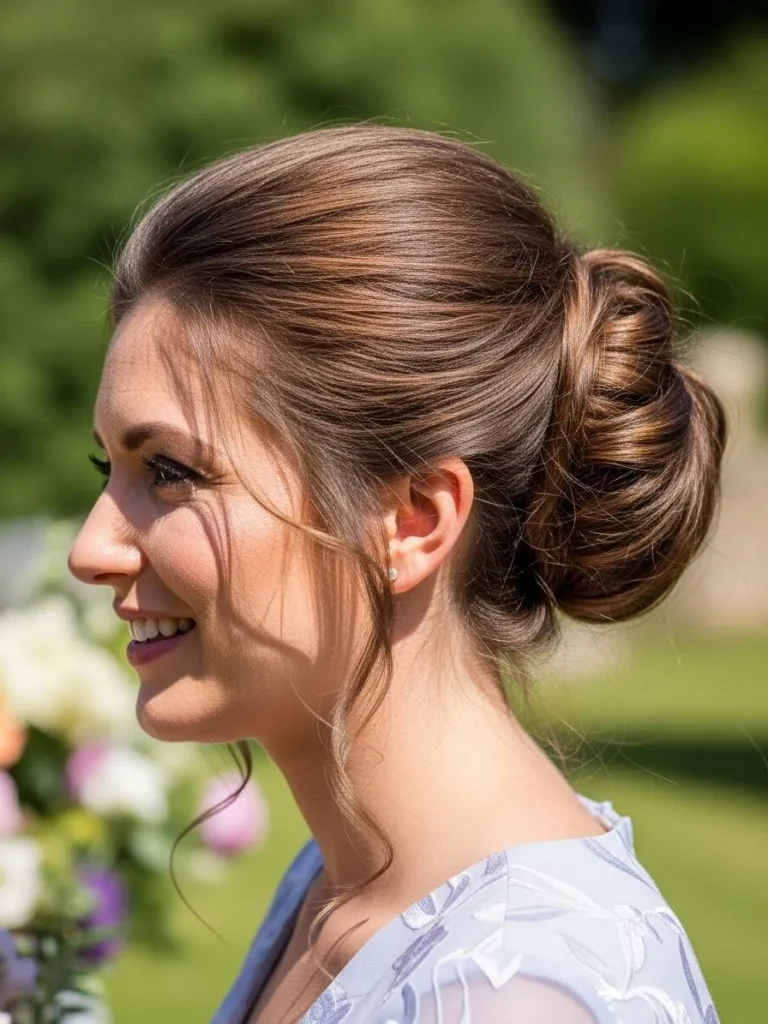 This hairstyle showcases a low bun paired with noticeable volume at the crown. The sides are softly smoothed back, while the bun itself looks full and secure. Everything feels balanced and timeless.
