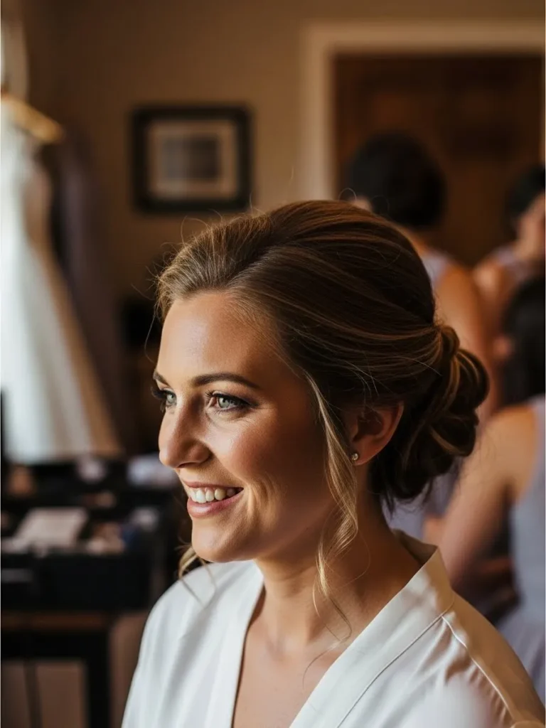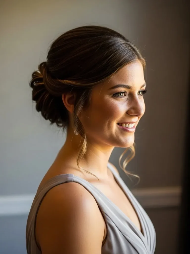 I love how dependable this look feels for a bridesmaid. The volume keeps it flattering, and the low bun makes it comfortable for hours. It is simple, elegant, and always photographs well.