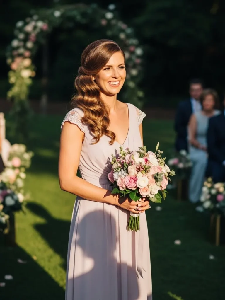 I always find this look incredibly charming and feminine. The volume makes it feel special, while the side sweep adds drama without being too bold. It is a great option for bridesmaids who want their hair down but still polished.