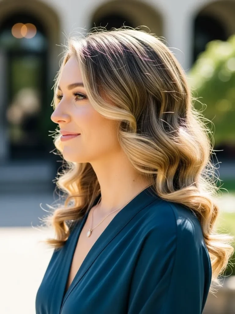 This hairstyle features long waves swept to one side with fullness at the crown and through the lengths. The waves are soft and defined, creating a flowy silhouette that moves beautifully. It pairs perfectly with sleeveless or delicate dresses.