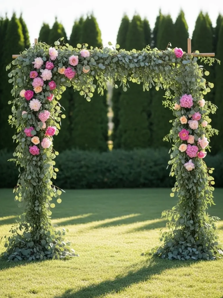 This flower arch features a clean square frame wrapped in flowing greenery, with soft blush and pink flowers placed gently along the sides and corners. The lawn setting feels open and fresh, while the mix of eucalyptus style leaves and pastel florals keeps everything light and summery. The simple structure lets the flowers shine without feeling heavy or overdone.