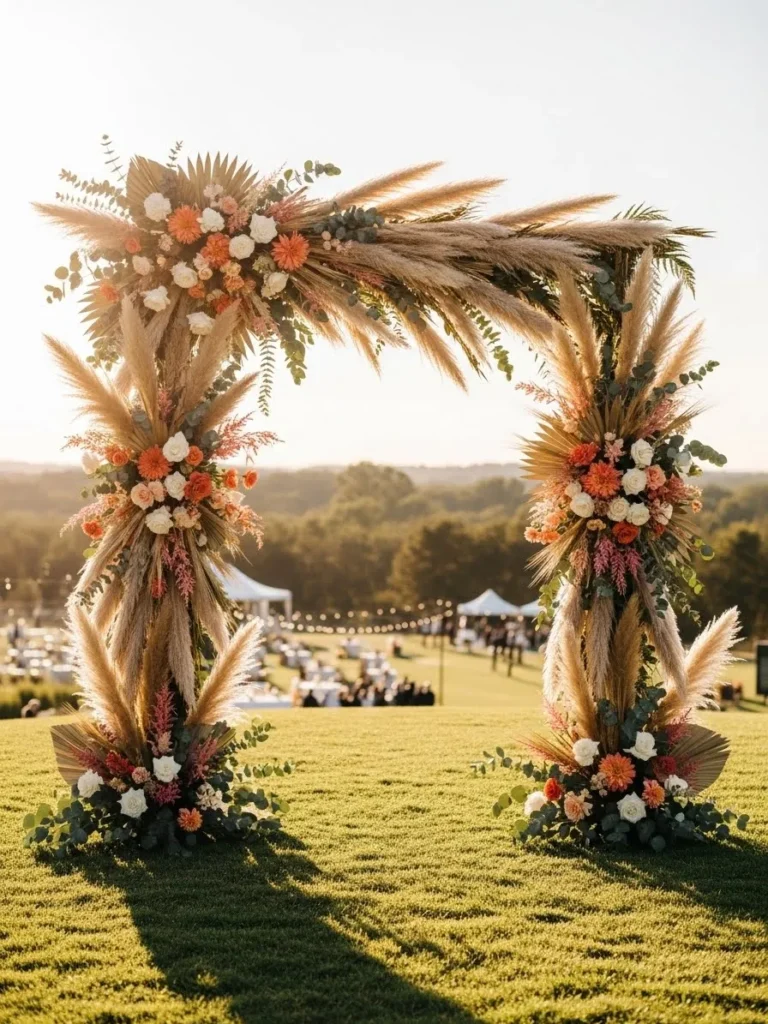 This arch makes a bold impression with dried palm leaves, warm toned flowers, and textured greenery. The florals are arranged symmetrically on both sides, creating a strong and balanced shape. The open field setting enhances the earthy tones and boho style.