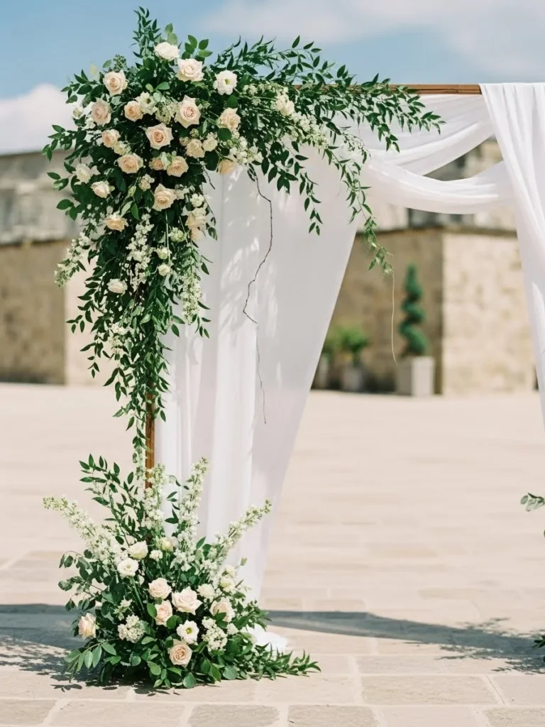This arch combines lush greenery and white florals with soft sheer fabric draped gracefully along the frame. The flowers are placed at the top and base, creating a beautiful flow from start to finish. The neutral tones keep the look refined and airy.