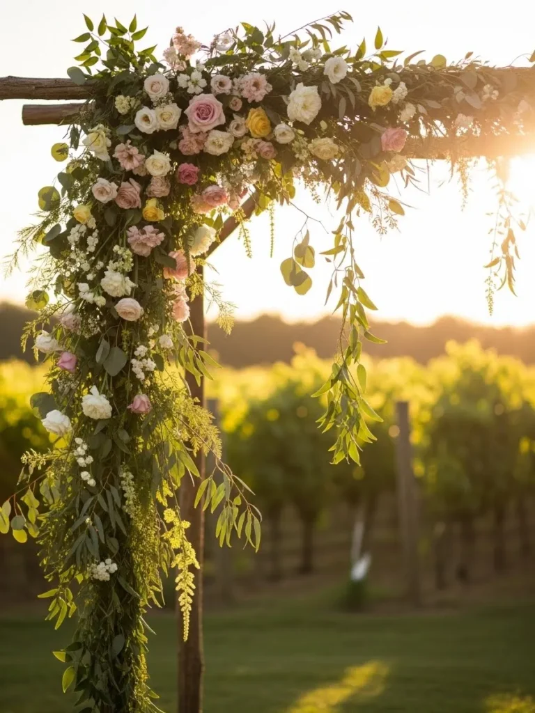 This arch combines soft blush flowers, trailing greenery, and a natural wooden frame set against a vineyard backdrop. The florals are arranged loosely, allowing sunlight to peek through and highlight the textures. Everything feels warm and golden, especially with the late afternoon light.