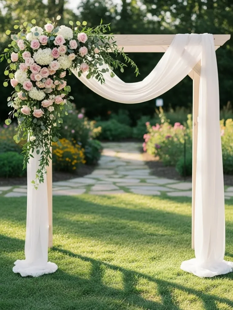 I think fabric instantly makes an arch feel more special. It adds a softness that feels romantic and timeless. This design feels perfect for couples who love a classic look with a gentle and airy touch.