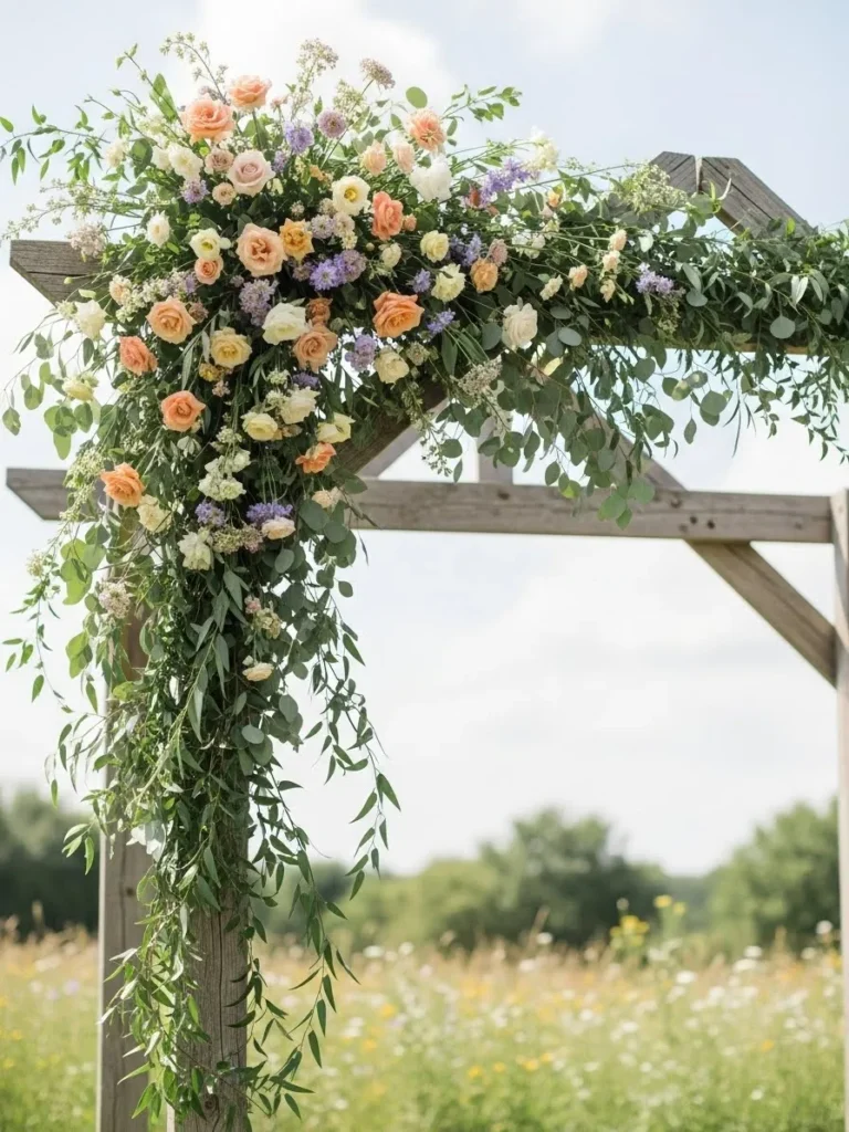 This wooden arch is dressed in loose clusters of peach, cream, and soft yellow flowers that spill naturally across the top and down one side. Long greenery strands hang freely, giving it that effortless meadow look. Set against a wildflower field, the whole setup feels relaxed and beautifully imperfect.