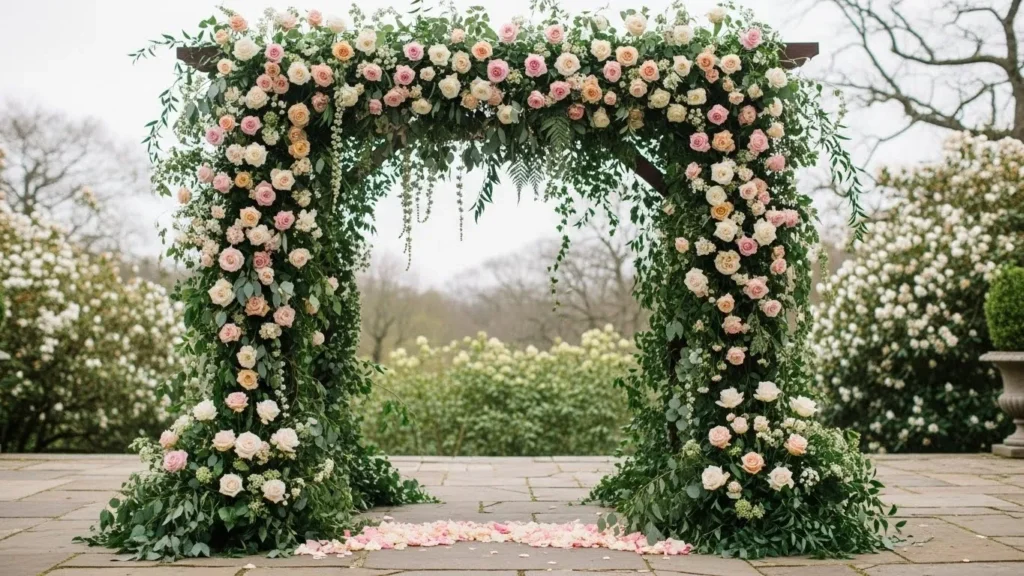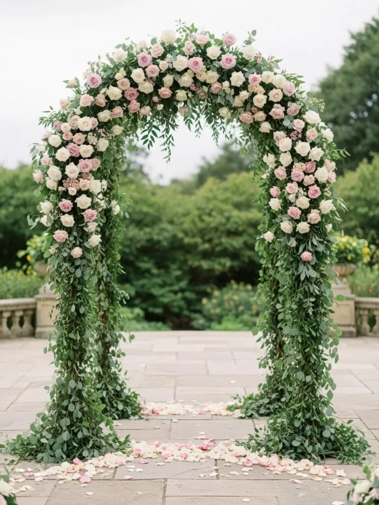 This arch features flowing greenery paired with soft blush roses arranged evenly along the frame. The florals drape gently toward the ground, creating a graceful and elegant shape. Scattered petals beneath the arch add an extra romantic touch.