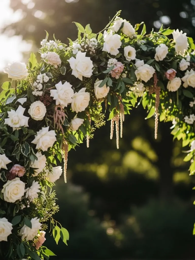 This arch is decorated with full white blooms and cascading greenery that hangs naturally from the top. The flowers feel rich and textured, while the greenery adds movement and depth. The background of soft trees and sunlight makes everything feel fresh and serene.