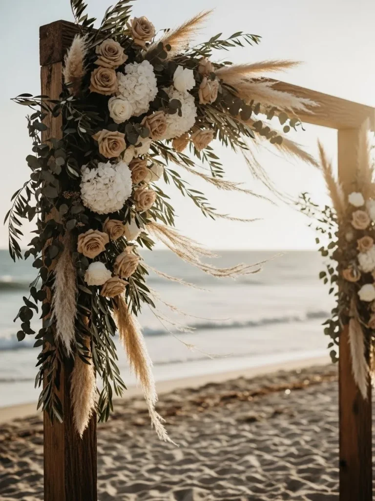 This beachside arch combines dried palm leaves, pampas grass, and neutral toned flowers for a relaxed boho look. The wooden frame keeps it grounded, while the textured florals add depth and movement. The ocean backdrop makes the soft beige and sand colors feel perfectly at home.