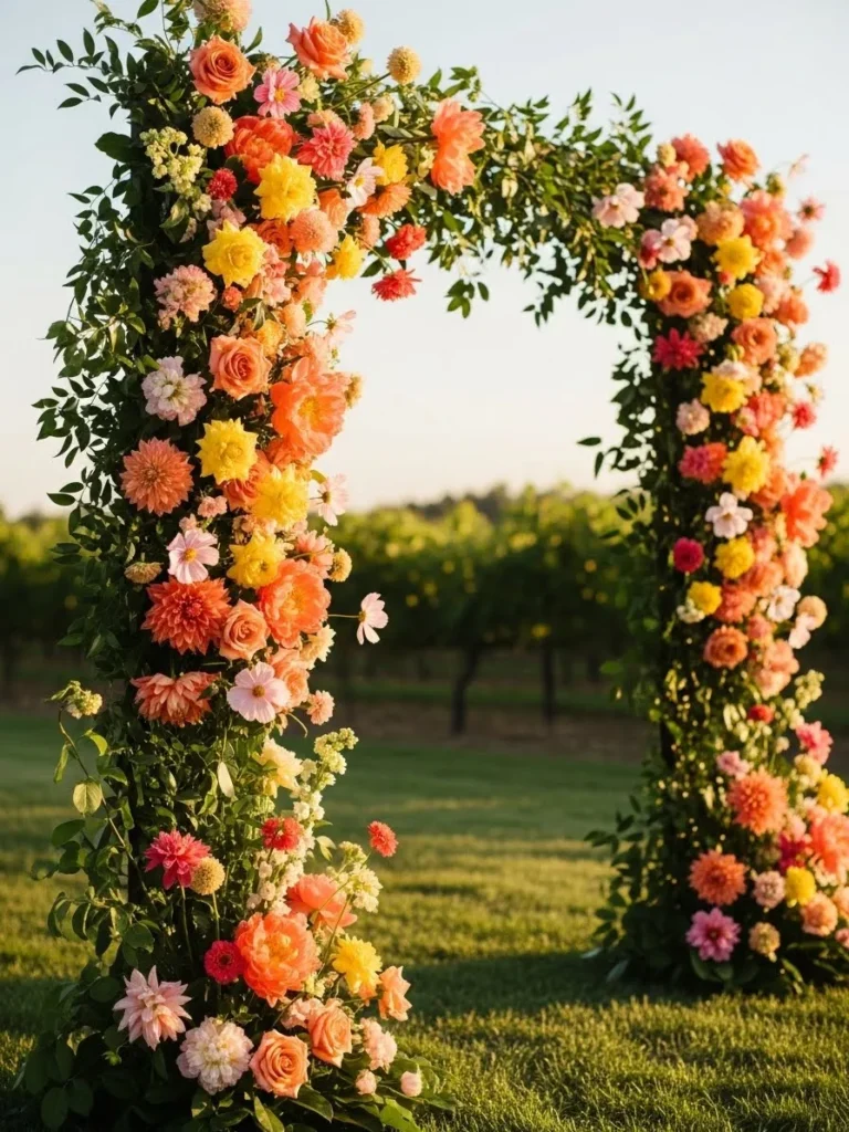 Bright pink, orange, and coral flowers cover this arch from top to bottom, creating a bold and joyful statement. The greenery weaves everything together, while the rich colors pop beautifully in the sunlight. Set in a garden space, it feels lively and full of energy.
