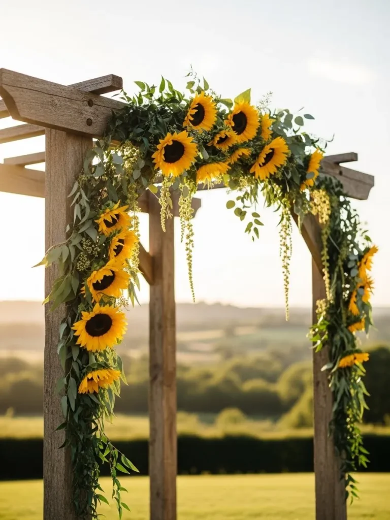 This wooden ceremony arch is decorated with bright sunflowers, soft greenery, and trailing leaves that frame the structure beautifully. The bold yellow blooms sit mainly along the top and one side, letting the natural wood show through. Set against rolling countryside, the whole look feels warm, cheerful, and full of late summer charm.