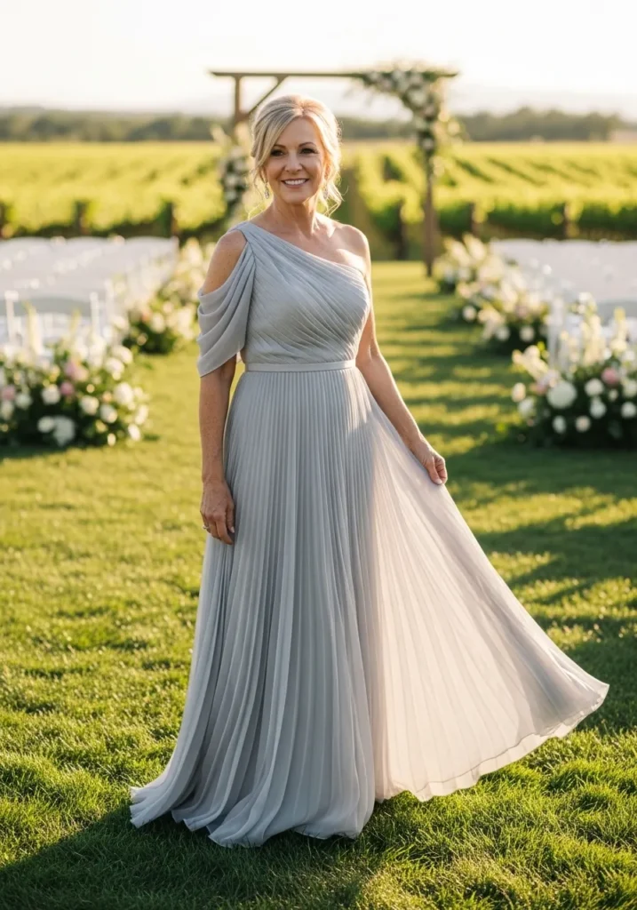 This design features a mature woman wearing a soft silver one shoulder chiffon gown with gentle pleating, a flowing skirt, and an airy silhouette set in a romantic outdoor ceremony space.