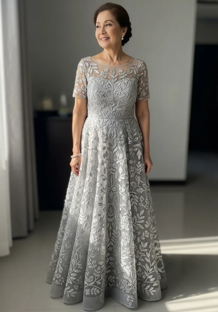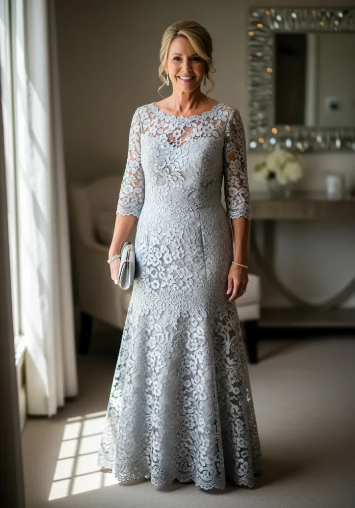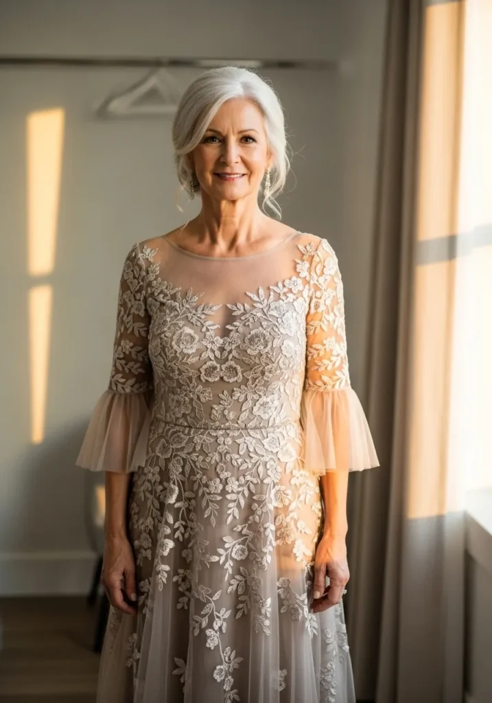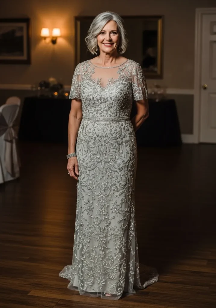 This gown showcases an older woman in a silver lace dress detailed with intricate beading, sheer sleeves, and a softly flared hem that adds just the right amount of drama, paired with warm indoor lighting that highlights every delicate detail.